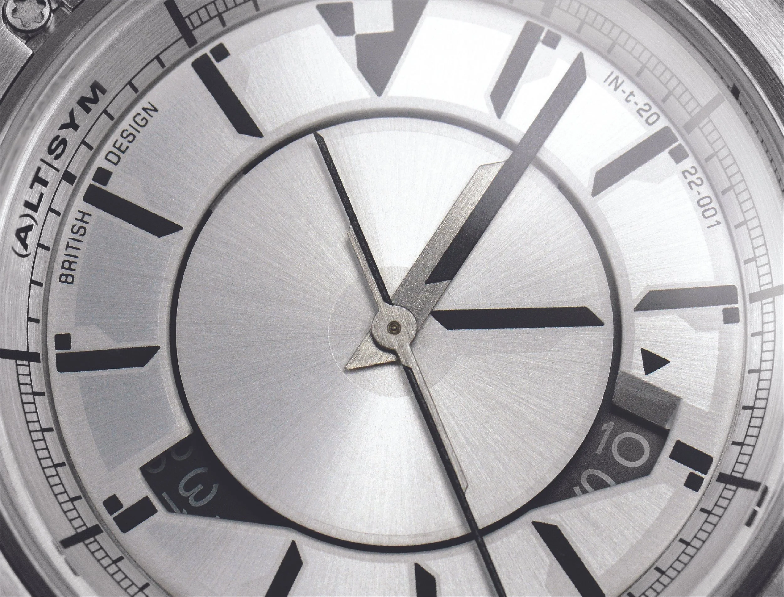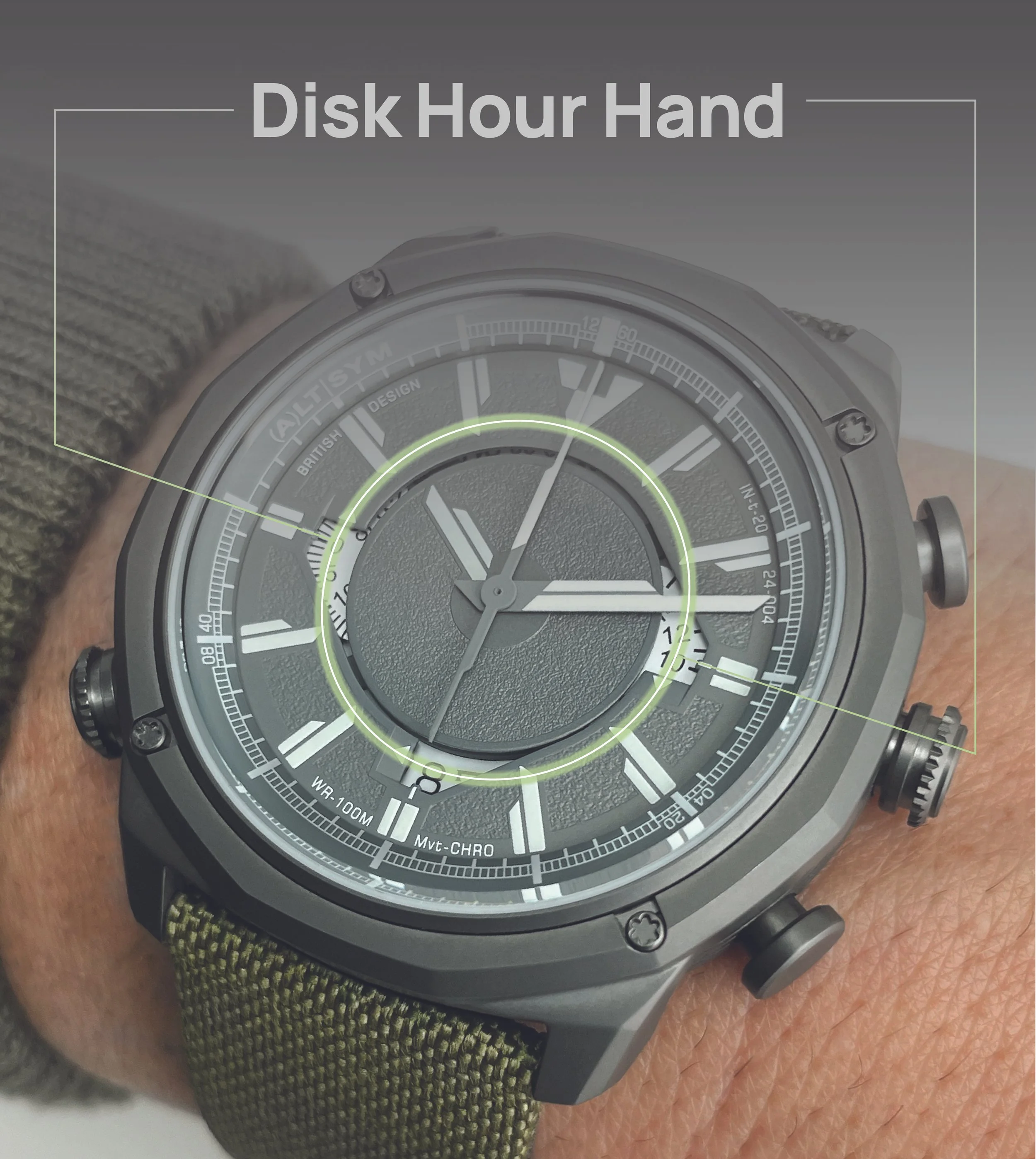 framing the disk hour and the minute/second hands is a distinctive, asymmetrical graphic silhouette that acts as a visual signature for the brand. While its exact proportions may shift depending on the movement or layout, the core shape will remain consistent. This detail sets the watches apart from conventional stick hands and uniform index designs, giving each model a unique identity. It’s a bold design element that directly reflects the brand’s name, Alternative Symmetry, and serves as a foundation for future creative exploration. It’s not just a shape; it’s a symbol of the brand’s commitment to doing things a little differently