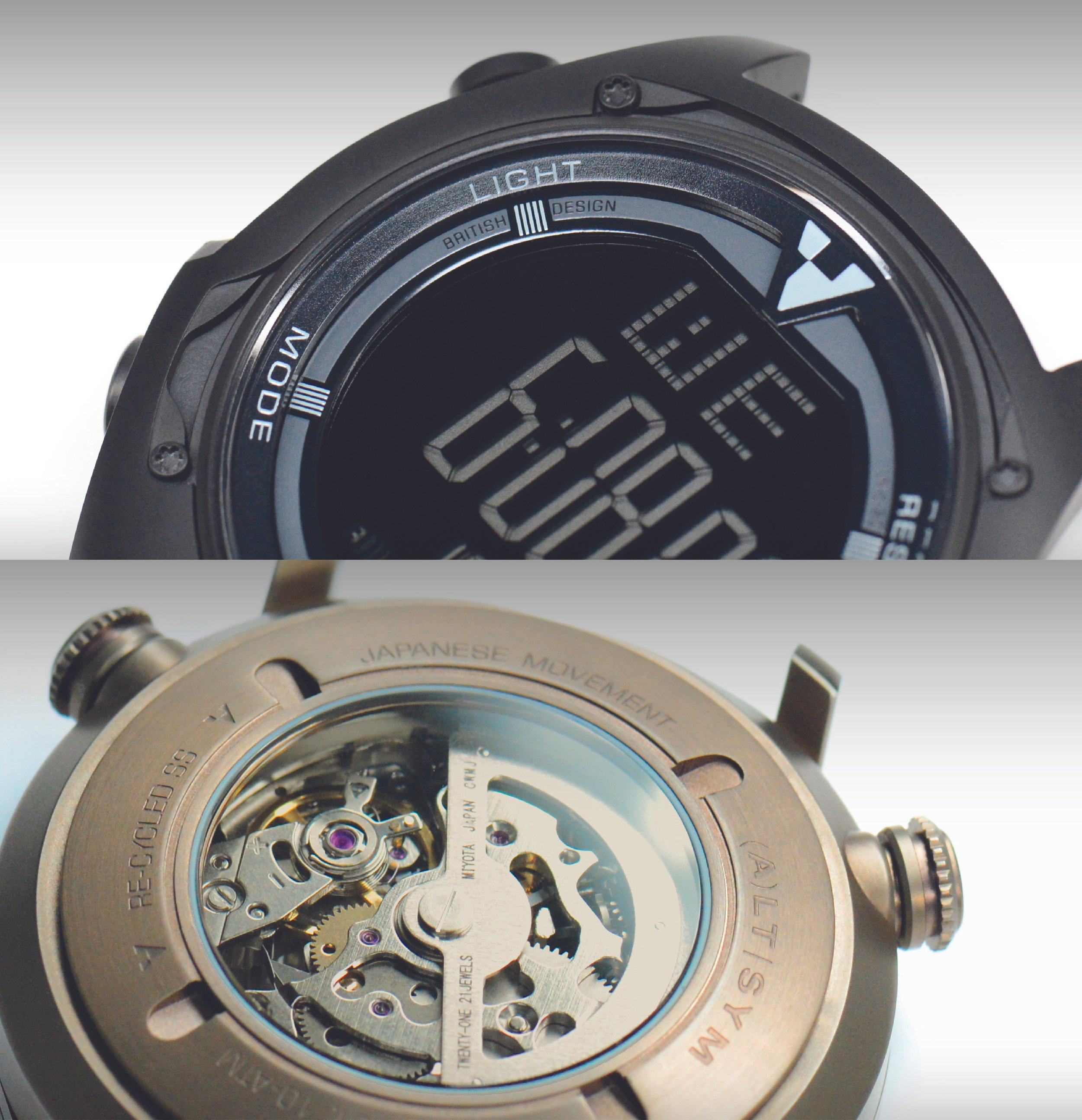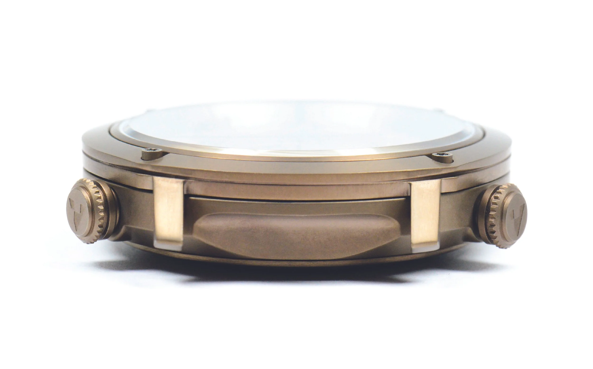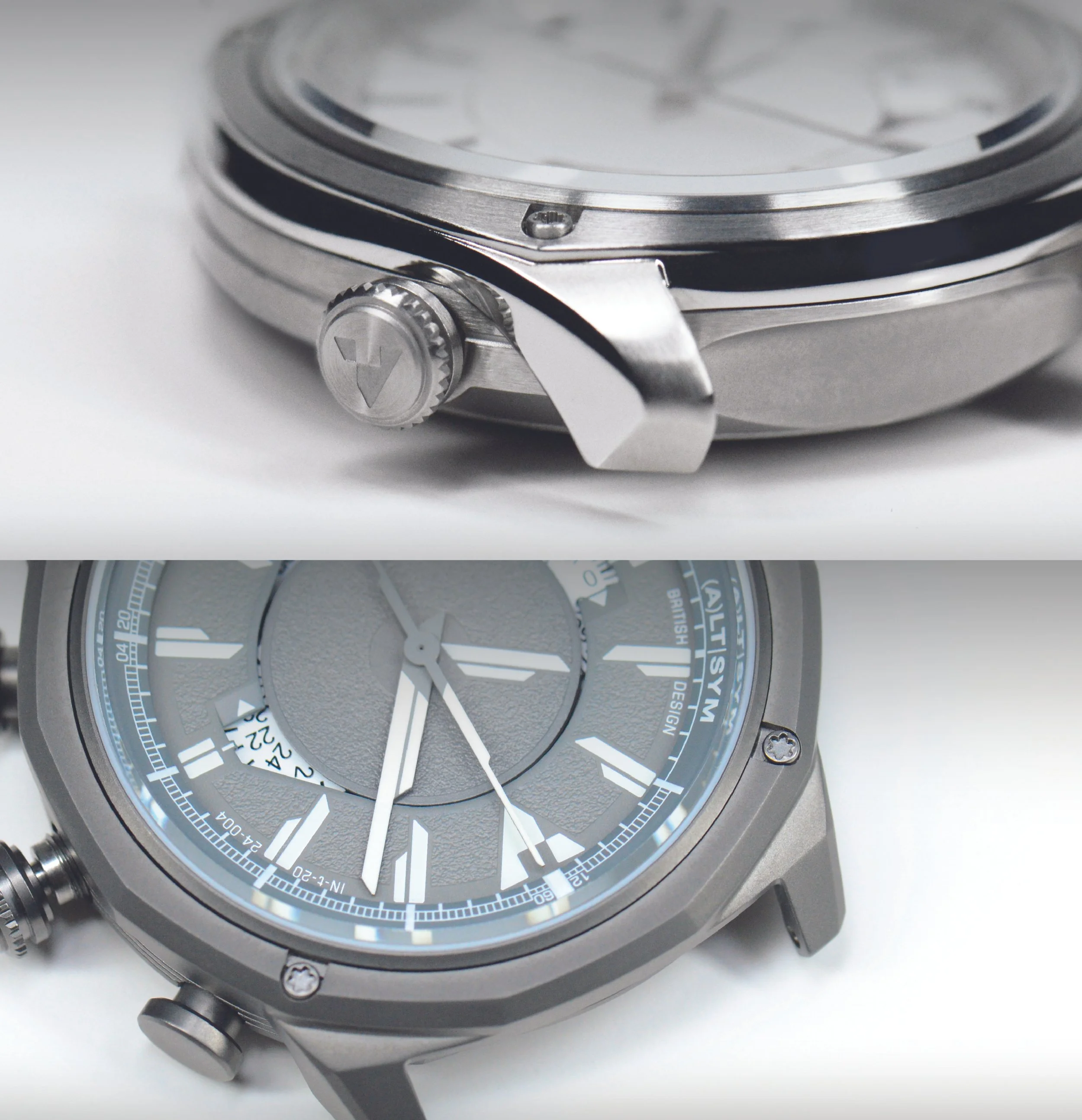 wherever possible, each watch will feature two crowns or similar controls. In this launch collection, one crown operates the movement, the other controls the internal rotating bezel. For the digital model, pushers are placed in the same location to maintain visual consistency. Going forward, expect a functional or aesthetic element to always sit at 4 and 8 o’clock, a defining visual feature that brings symmetry in an unexpected [Alternative] way