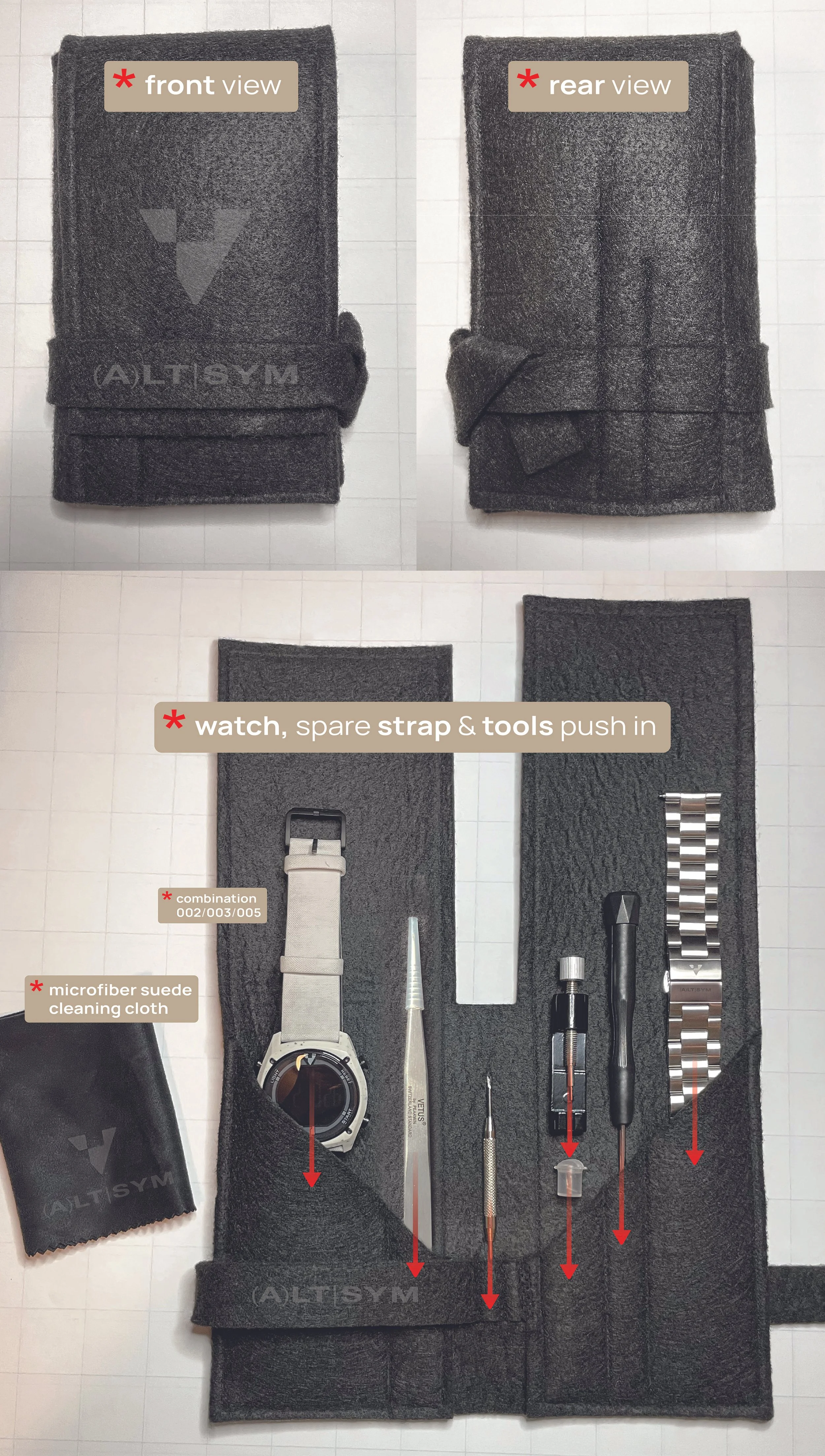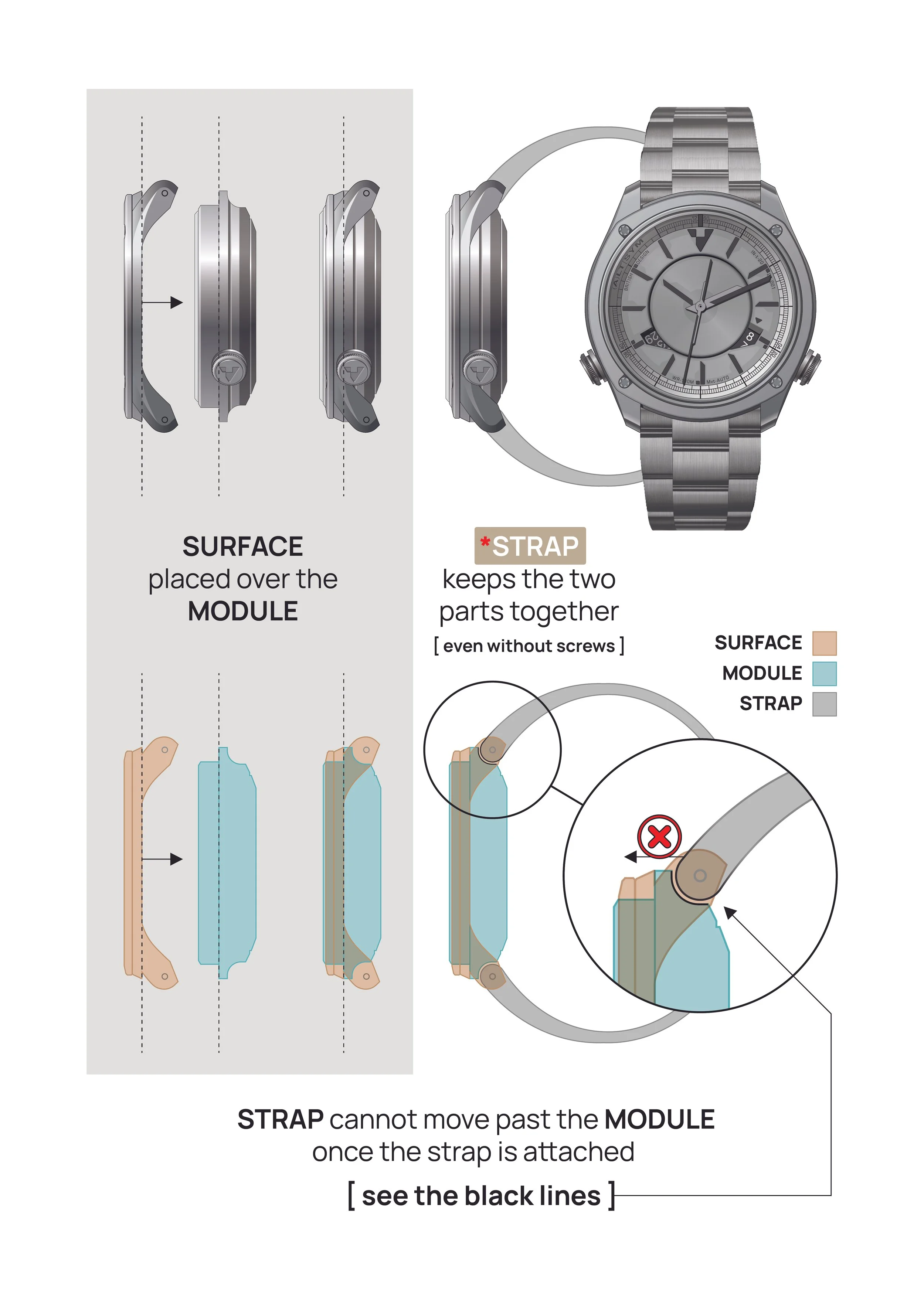 a carefully considered feature of our watches is the STRAPS, which function as a backup locking mechanism between the SURFACE and the MODULE. In the unlikely event that the TORX SCREWS are not fastened, these components will remain securely in place, ensuring your watch won’t come apart while you’re wearing it. For more details on this innovative feature, check out the diagram and the video below