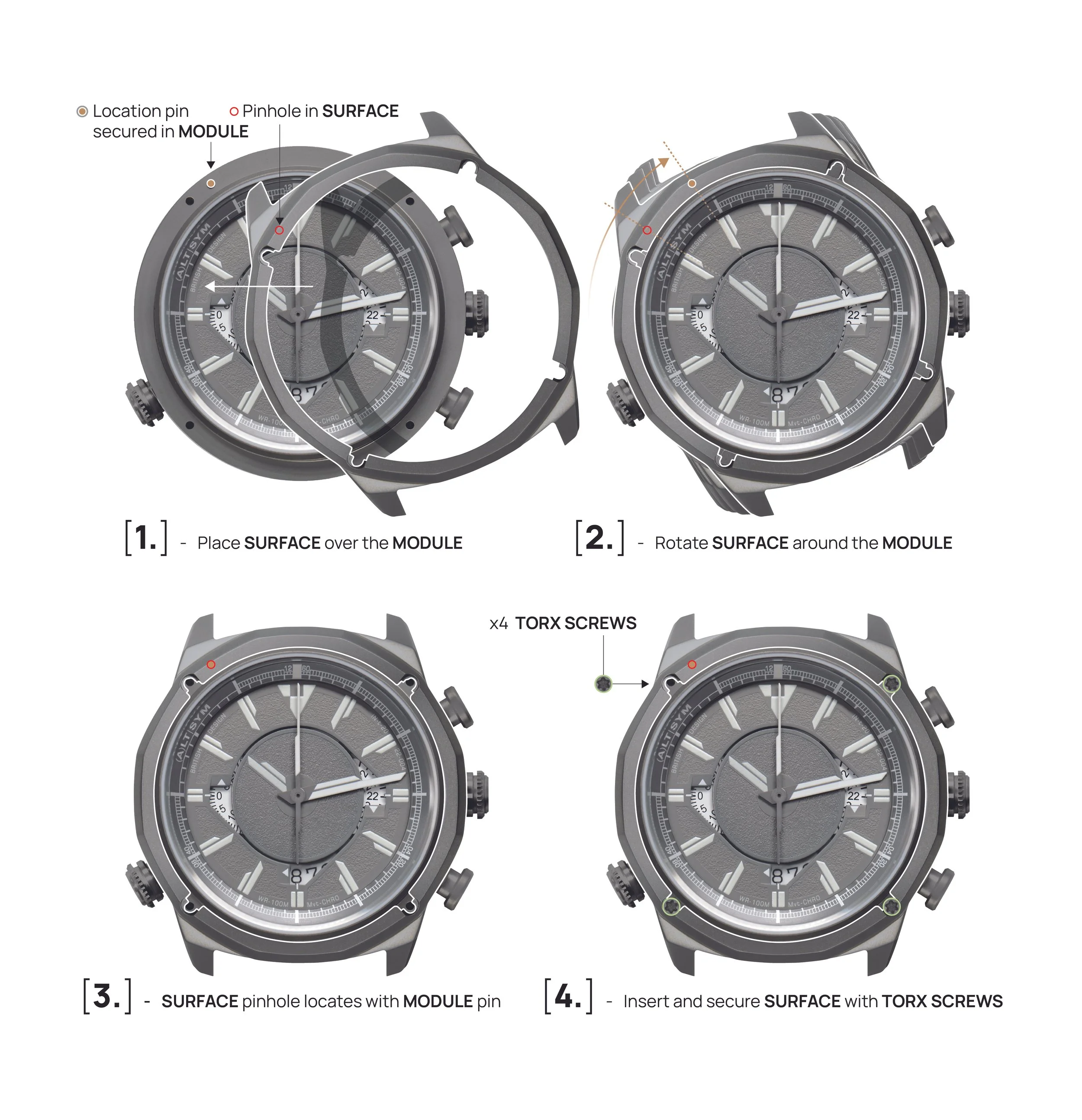 aligning the SURFACE with the module to attach the TORX SCREW’s is incredibly straightforward. A small location pin has been discreetly integrated into the MODULE’s top structure, hidden beneath the lug. This pin fits into a corresponding pinhole on the underside of the SURFACE; when you rotate the components together, this pin ensures a secure and precise connection during the swapping process