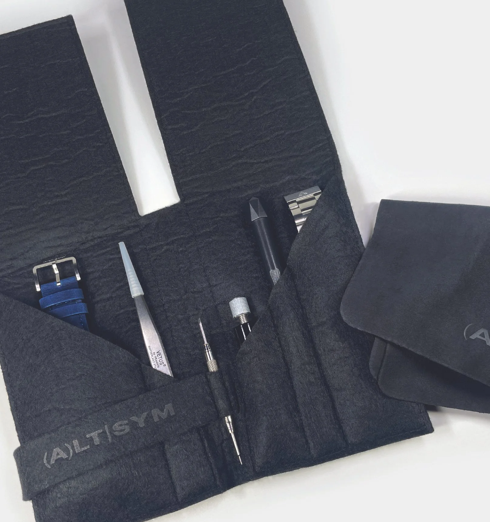 designed to protect your timepiece and its components. This pouch not only safeguards your watch but also features a dedicated slot for the spare strap that comes with each timepiece. Crafted exclusively for ( A ) L T | S Y M customers, the pouch boasts a modern, stylish design with individual compartments for your tools