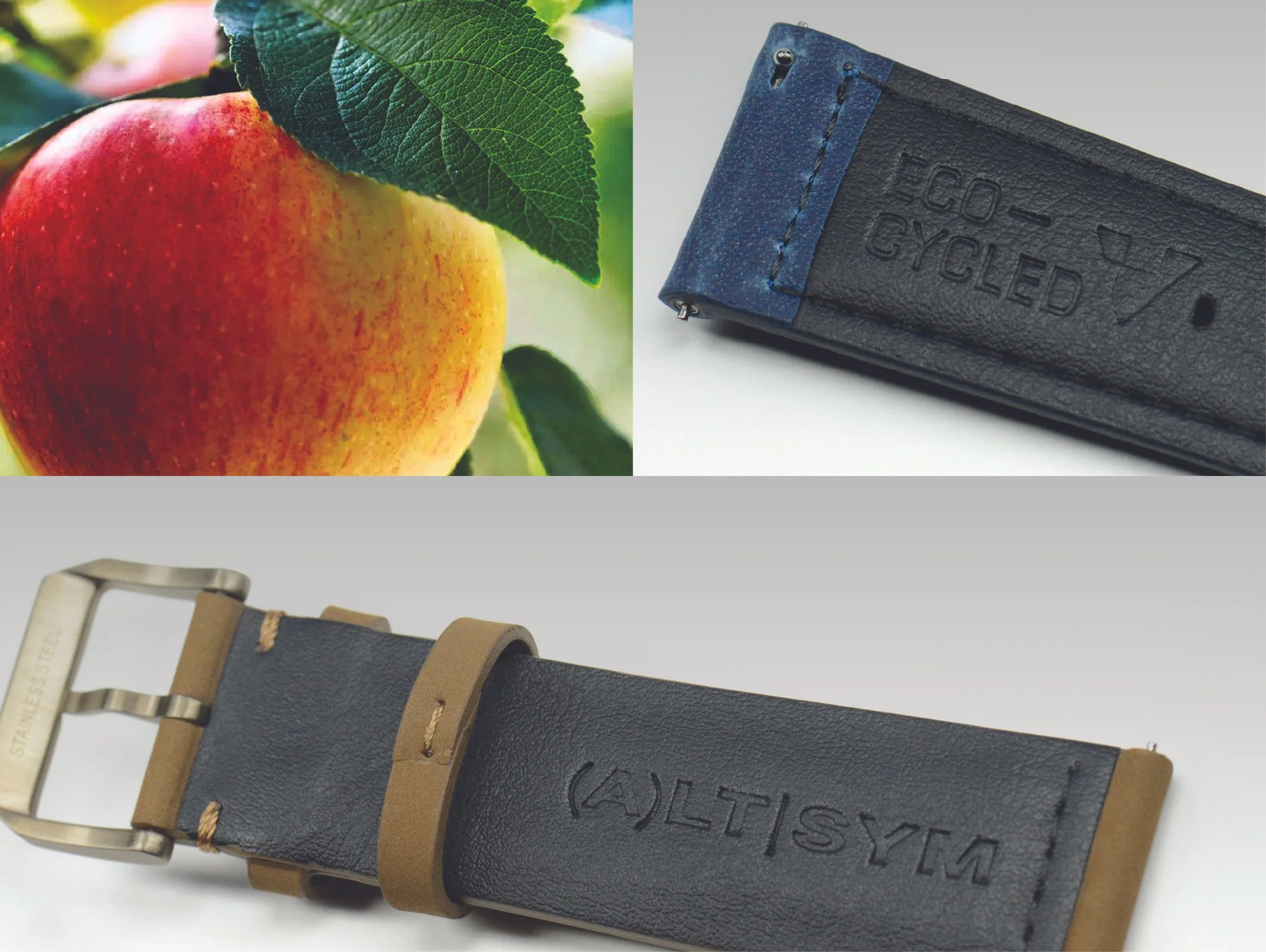 additionally, the backs of our straps are lined with G-Pomme, a 100% vegan leather that integrates apple peels into a sustainable material sourced from Italy. This innovative alternative is ideal for those who prioritize animal welfare and environmental responsibility